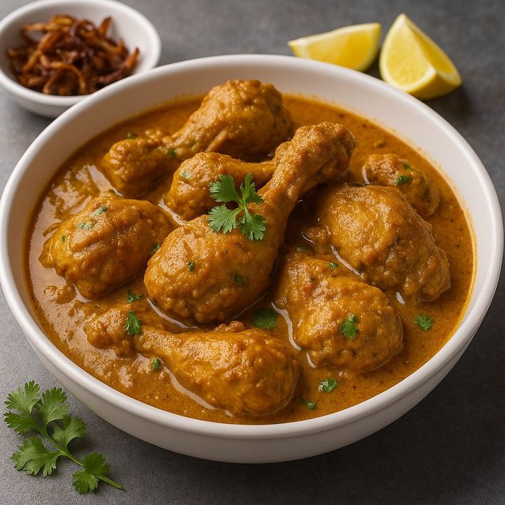Soft chicken prepared in smooth korma gravy with balanced spices and creamy texture.